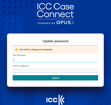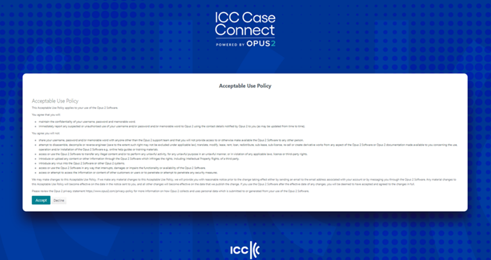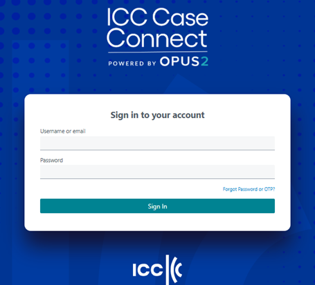 To login to ICC Case Connect powered by Opus 2 for the first time, an administrator must first create an account and assign a role to you.