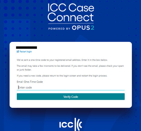 2. You will receive a six-digit one-time access code (OTP) at your registered email address from no-reply@iccwbo.org. The OTP will remain active for 5 minutes and may be regenerated by simply restarting the login process.